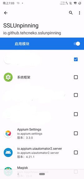 重启后打开LSPosed app,选择模块,选择SSLUnpining,勾选需要禁用SSLUnpining的应用即可