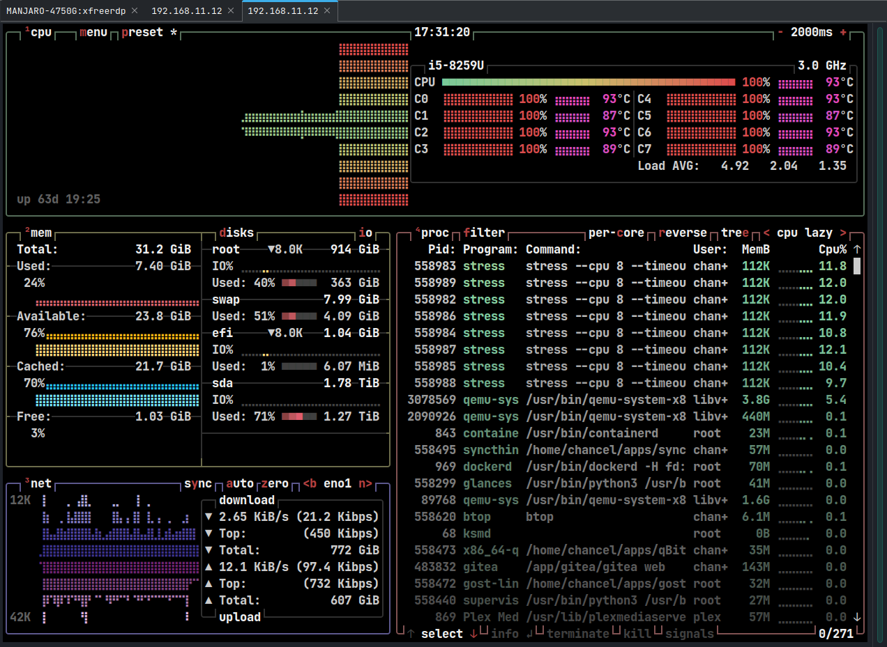 然后,在另一个终端窗口中输入btop命令来监控压力测试情况