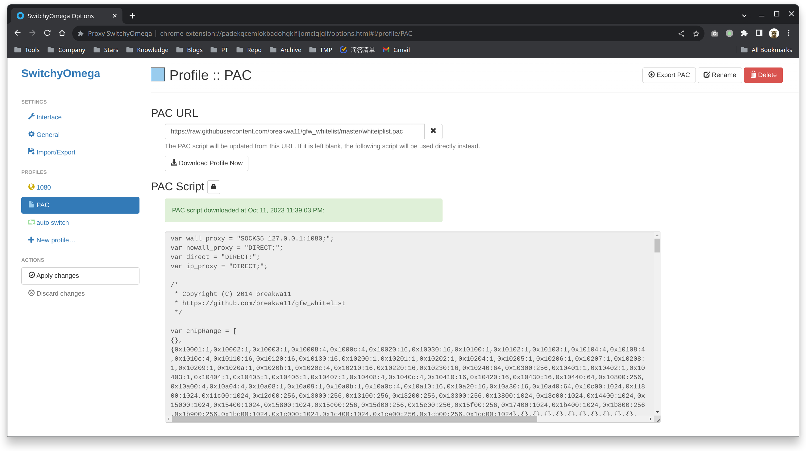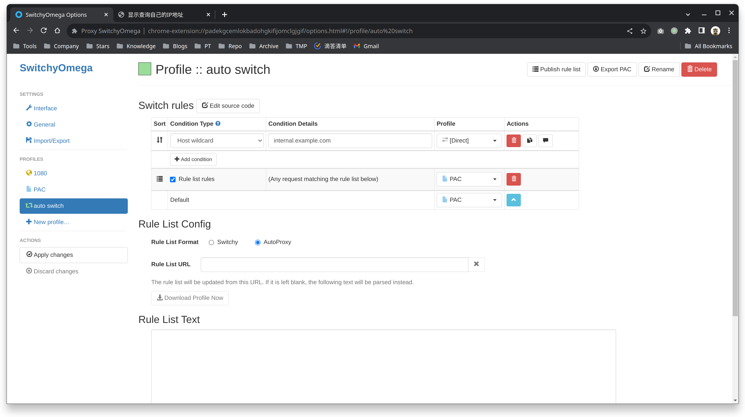 4. PAC 模式 (Proxy Auto-Config): PAC 是 Proxy Auto-Config 的缩写,这是一种网络技术,它允许你使用一个 JavaScript 文件来定义哪些网址应该使用代理,哪些则不应该,SwitchyOmega 的 PAC 模式就是使用这种技术