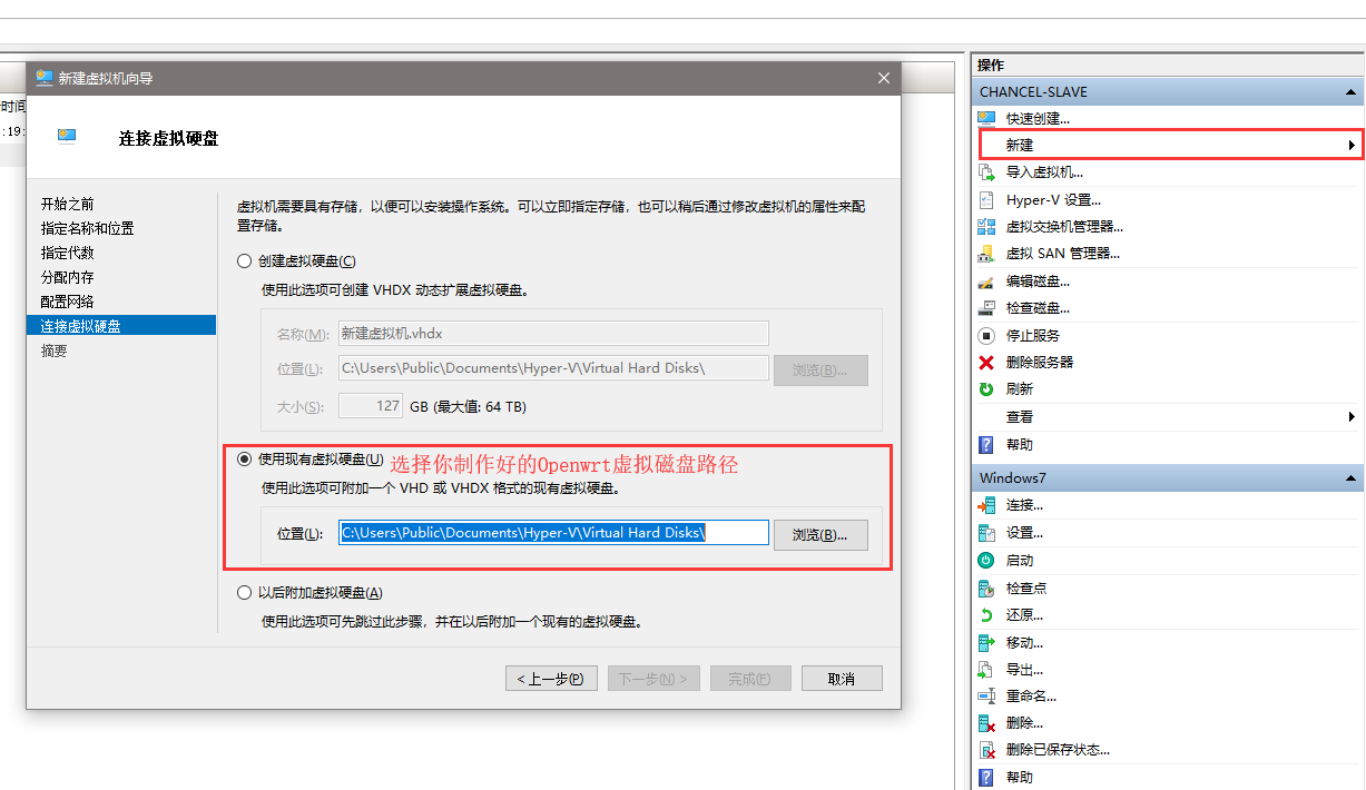 根据上面制作出来的虚拟磁盘,我们这里创建一个Hyper-v的虚拟机,并在磁盘那一步选择已存在的虚拟磁盘文件,如下图