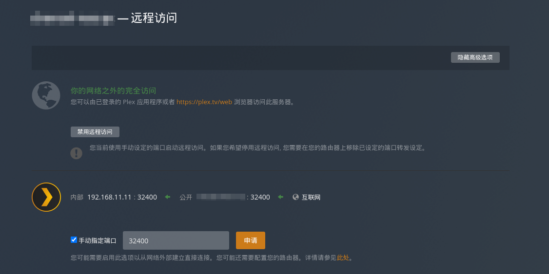 打开PLEX后台-远程访问,选择手动指定端口,输入32400,点确认后可以看到远程访问提示可用,如下图