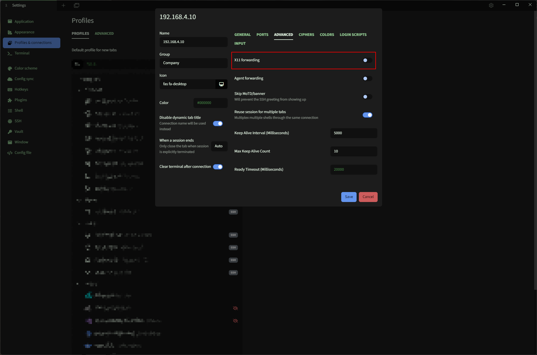 接着使用任何ssh客户端,我用的是 tabby,打开具体ssh服务器设置,并勾选 X11转发 ,如下